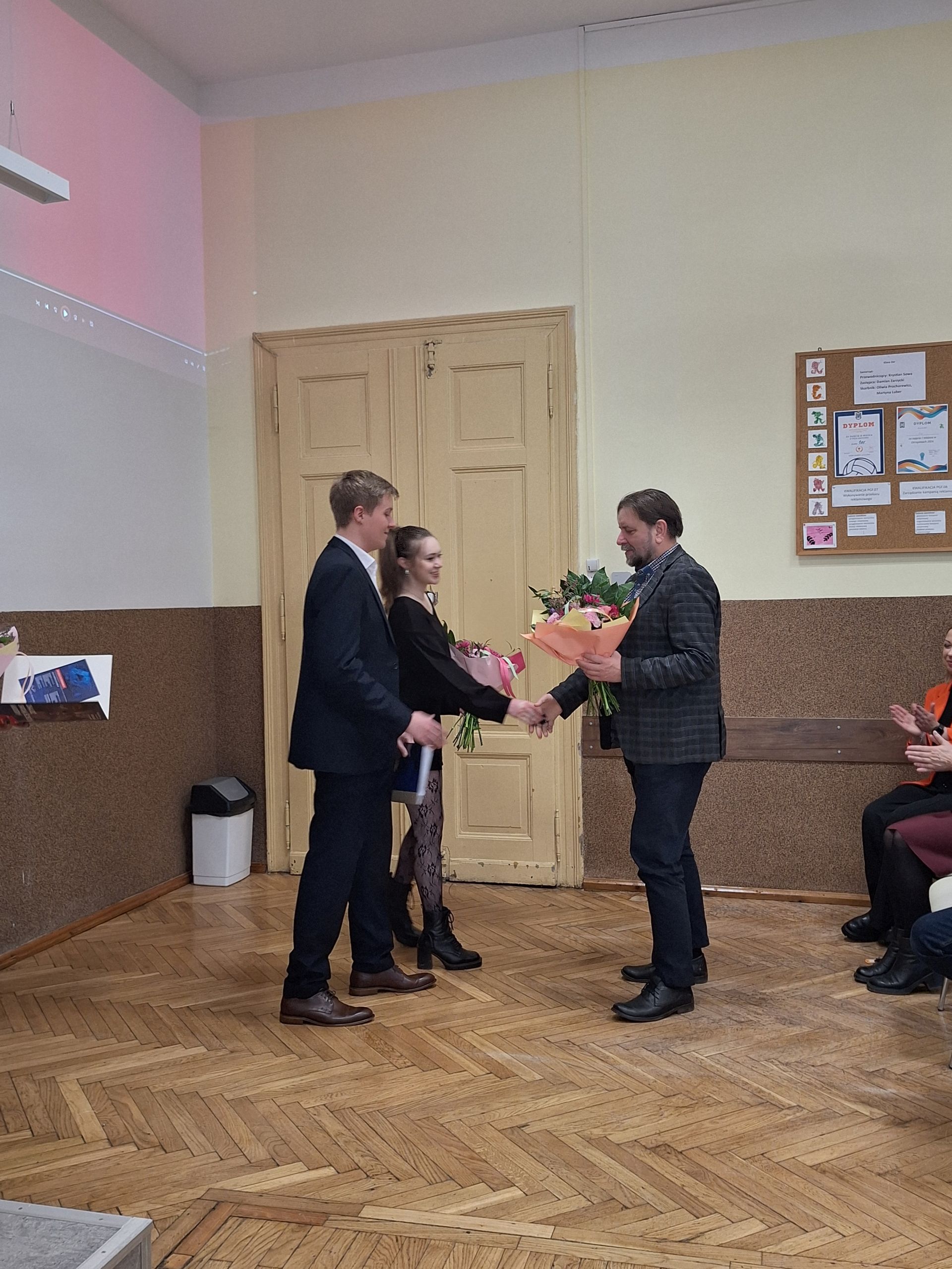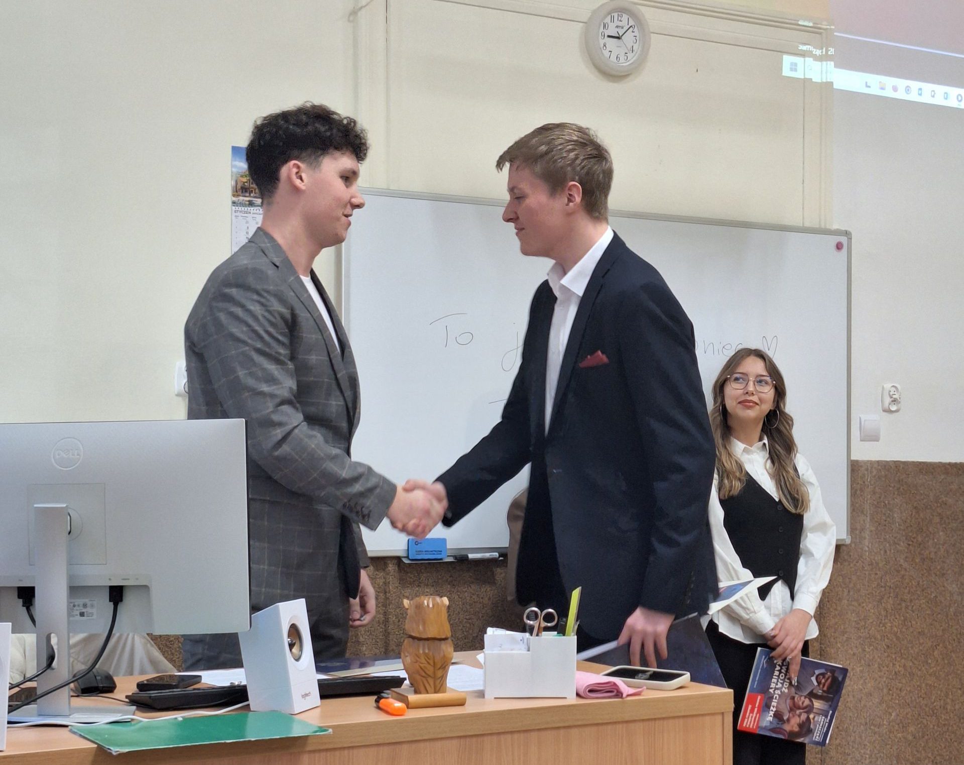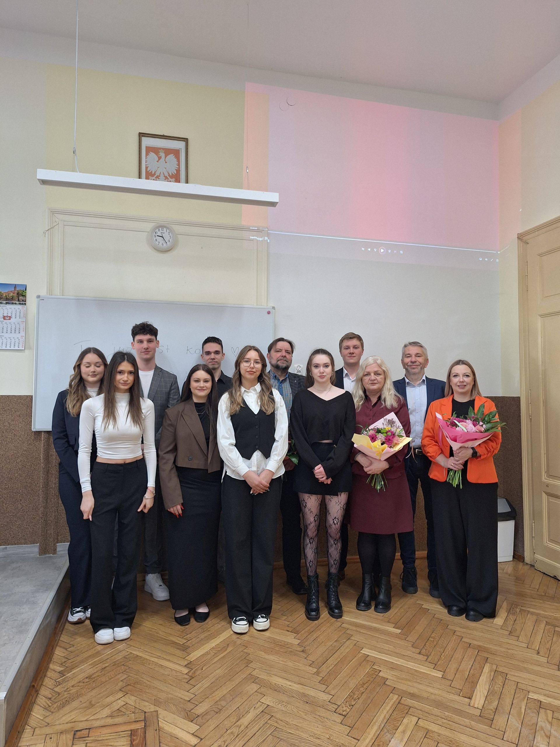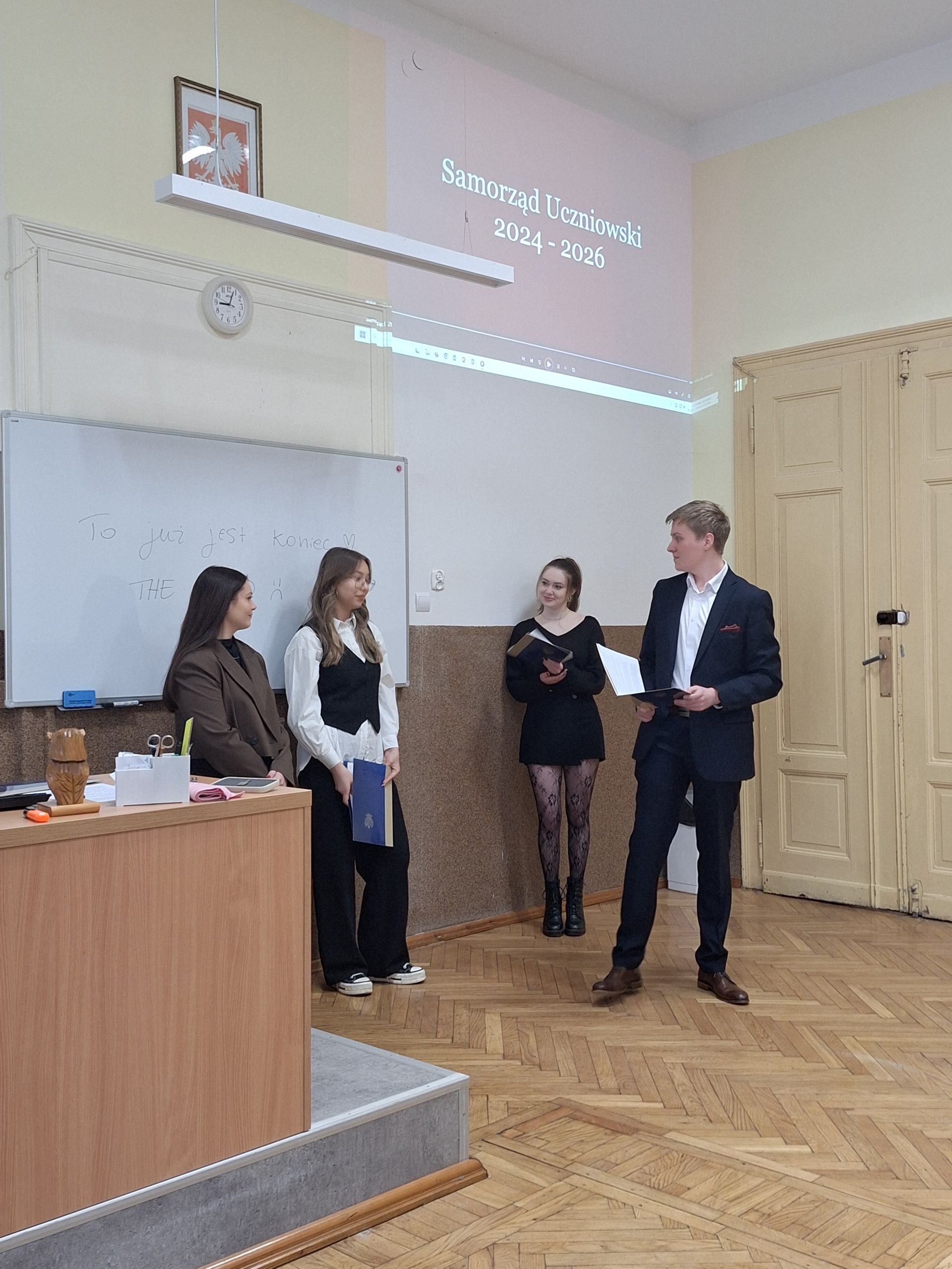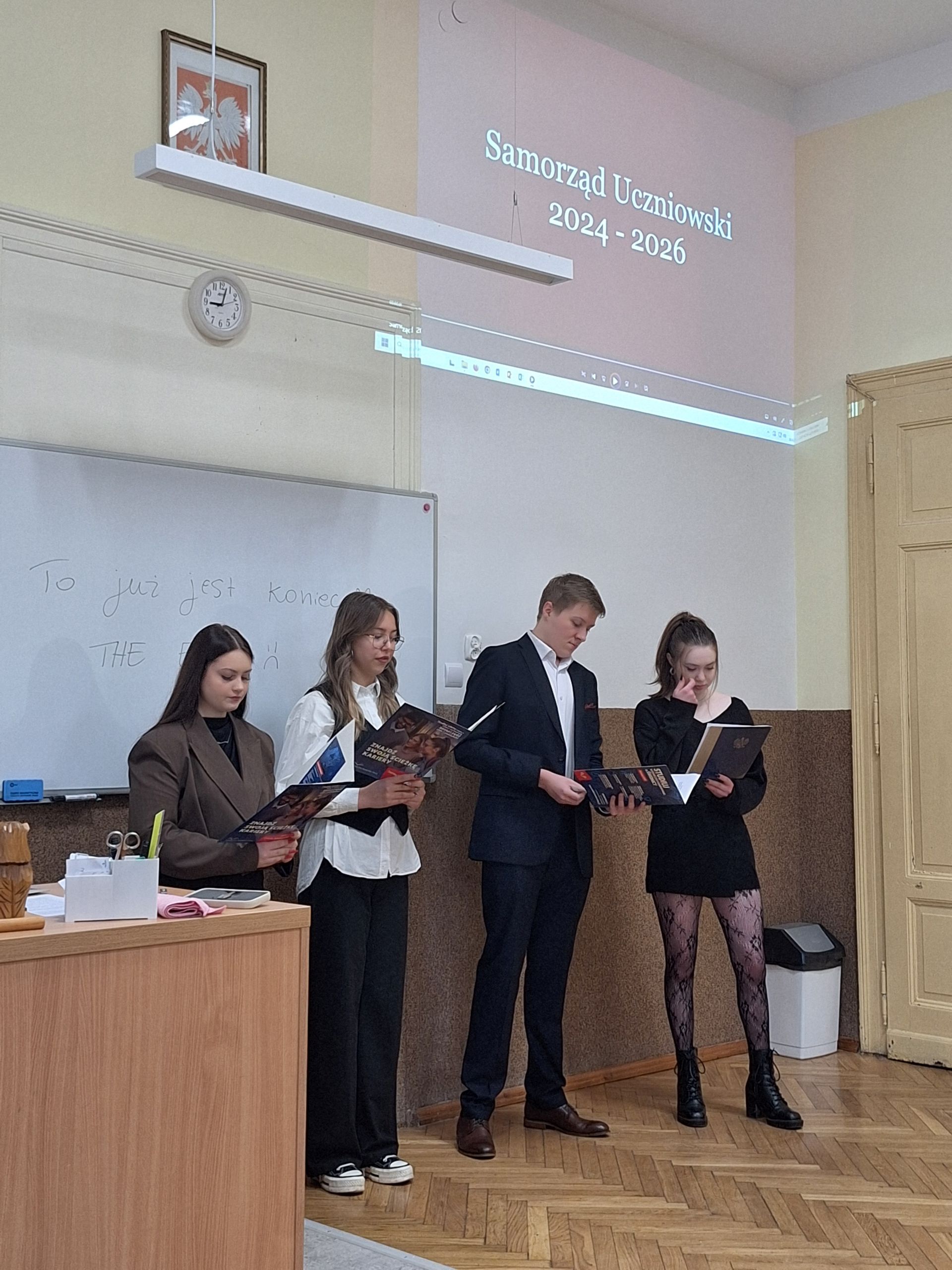 W dniu 26.02.2026 odbyło się uroczyste zabranie Samorządu Uczniowskiego, na którym w obecności Pana dyrektora Krzysztofa Osiaka, Pani wicedyrektor Izabeli Osieckiej, Pani wicedyrektor Mirosławy Ryś oraz opiekuna SU pana Artura Fili odbyło się przekazanie funkcji w Prezydium Samorządu Uczniowskiego ZSE, w oparciu o wyniki wyborów z dnia 30.01.2026. Odchodzący samorząd przedstawił swoje ponad dwuletnie dokonania, ustępująca