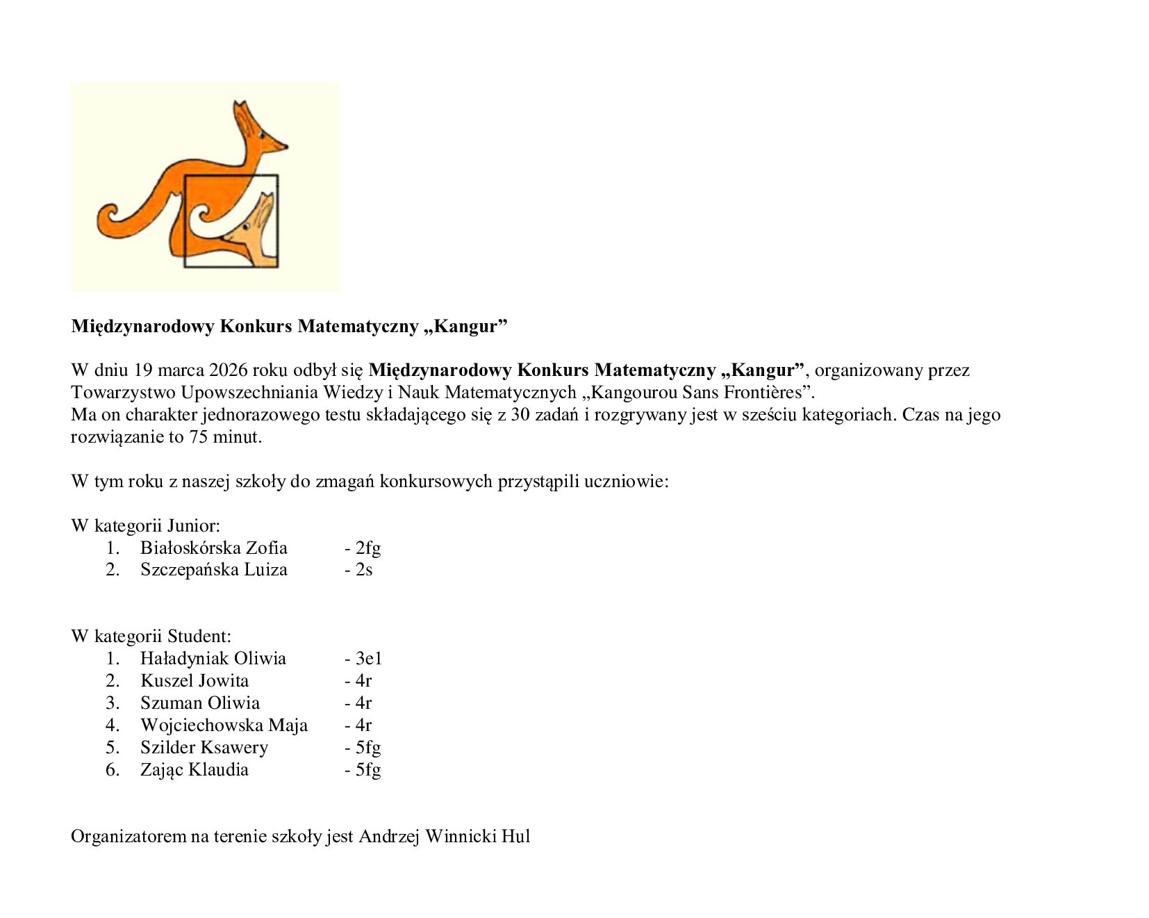 AKTUALNOŚCI MIĘDZYNARODOWY KONKURS MATEMATYCZNY „KANGUR” 22 marca 202622 marca 2026 Malgorzata Tekst i zdjęcia : Andrzej Winnicki Hul